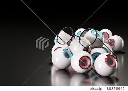 Round-shaped glasses were placed on several blue and brown eyeballs on a black floor and a dark background. The concept of eye problems and eye business concept.