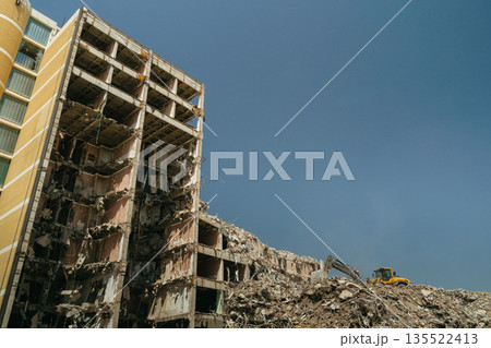 Excavator Clearing Rubble from Collapsed High-Rise building