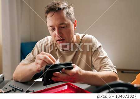 High-angle view of technician male assembling wi-fi module using tools at home office desk, focusing on intricate components and ensuring proper connection. Concept of desktop PC maintenance