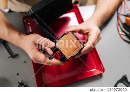 Close-up cropped shot of technician working on electronic device, holding computer hardware with exposed cooling fan, performing repairs and maintenance on tech equipment in modern workshop.