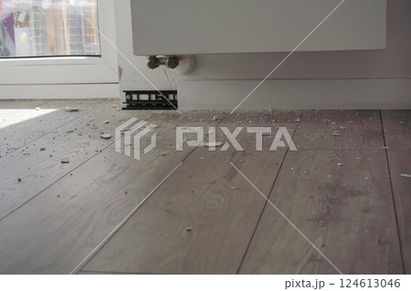 the concrete pieces on floor, renovation dust on wooden floor, broken wall, fixing