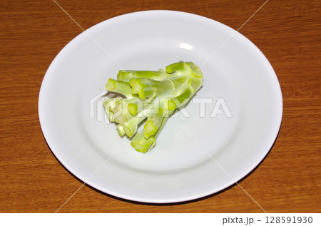 白い皿に乗せた生のブロッコリーの茎(透明背景)