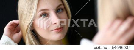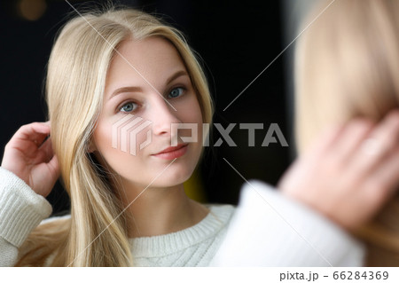 Happy girl looks in mirror her eyebrows and face