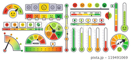 Customer satisfaction meter. Mood scale, indicators, sliders and buttons, emotions rate measuring, feedback app interface, infographics elements for site and presentation tidy vector set