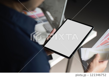 Graphic Designer Selecting Colors on Tablet for Creative Design Projects in Modern Workspace