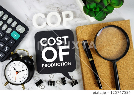 COP Cost Of Production acronym with calculator, alarm clock and magnifying glass, Business concept background