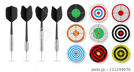 Paper targets with dart arrows and shadows. Shooting range round target, divisions, marks and numbers. Gun shooting practise and training, sport competition. Bullseye and aim. Vector illustration