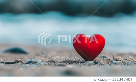 Red heart standing on a sandy beach with blurred ocean waves in the background, creating a romantic atmosphere perfect for valentine's day, woman's day, or spring celebrations