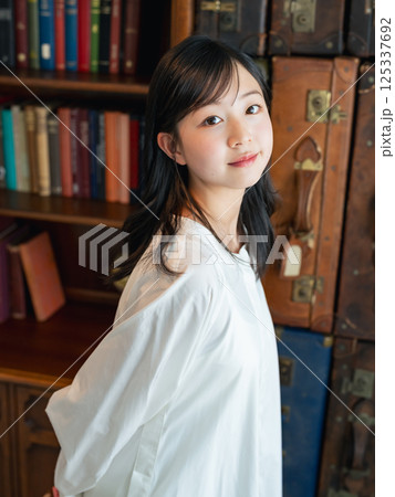 本棚の前に立つ少年 記念写真 ハーフ成人式 七五三 写真館