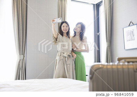 宿泊先のホテルでスマホで記念撮影をする親子 母娘 全国旅行支援