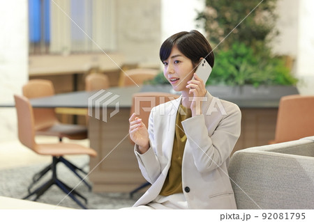 あごに手を当て電話の話を聞くビジネスウーマン1