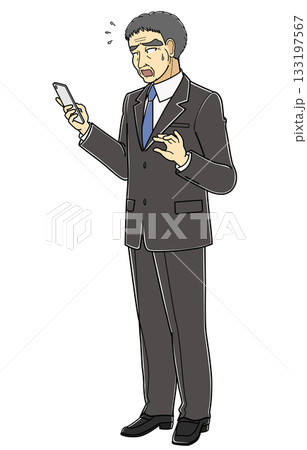 困った表情でスマートフォンを見ているスーツの中年男性・斜め左向き