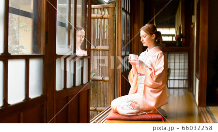 ふたりの着物女性 着物姿の外国人と日本人 着物で京都観光 白川と京都の街並み イメージ素材