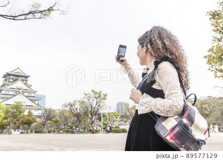 日本を旅行する外国人 インバウンド 外国人旅行者 スマートフォンで撮影する女子 イメージ素材
