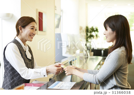 受付でカードを受け取る白衣姿の女性