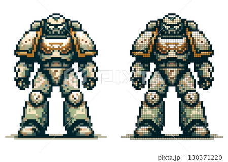 A detailed pixel art robot is poised in a heroic stance, showcasing intricate design elements that reflect a classic video game style. The digital atmosphere evokes nostalgia and excitement