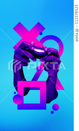 Hands holding game controller with geometric shapes against gradient neon background. Growing popularity of gaming industry. Streaming. Online gaming culture