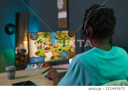 Gamer at home gaming and enjoying leisure time. African american man sitting on couch in blue neon lit living room, playing videogame on console, relaxing after hard day at work