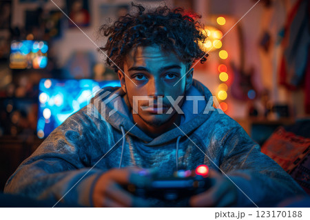 Young man sits in his dimly lit room, completely absorbed in a video game, holds a controller with precision, his eyes locked on the screen, demonstrating the intensity of the gaming experience