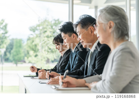 セミナー・講習会を受講するスーツ姿のビジネスマン男女