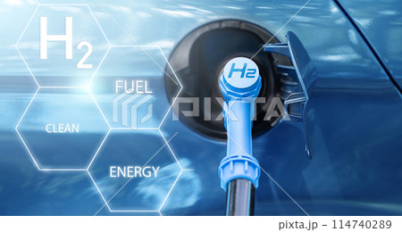 Close up of fuel cell car with connected hydrogen fueling nozzle.