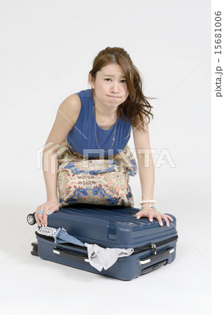 スーツケースに荷物を山のように詰め込む女性