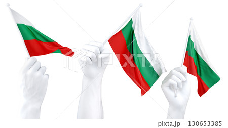 Hands waving flag of Bulgaria isolated on white. 3d Rendering