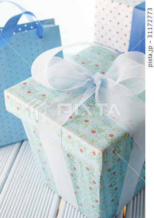 フェスティブな祝祭シーンに映える、青いサテンリボンの高級ギフトボックス