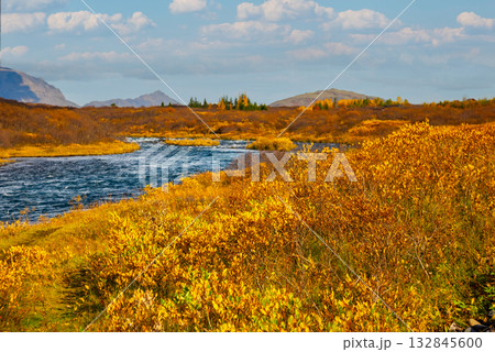 Autumn landscape features a river flowing through a forest filled with vibrant fall foliage in Iceland. The scene includes colorful trees, calm water, and distant mountains under a cloudy sky