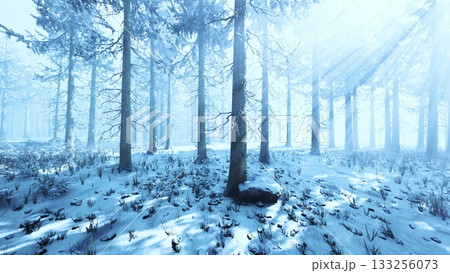 Tall trees stand majestically in a winter forest, their branches adorned with snow. Soft blue light filters through, creating a serene and magical atmosphere, perfect for quiet reflection.