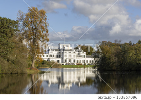 Beautiful Soestdijk Palace reflects in calm water surrounded by trees in Baarn, Netherlands during a clear day