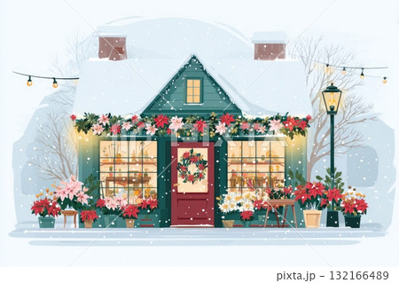 Cozy winter cottage adorned with festive flowers and snow, creating a charming holiday atmosphere