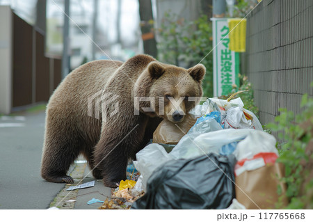 クマ出没注意の看板と住宅街のゴミ捨て場でごみを漁るヒグマ。クマの被害のイメージ。