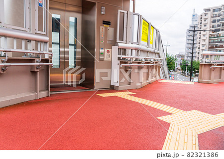 歩道橋のエレベーター前に設置された点字ブロック 線状ブロック