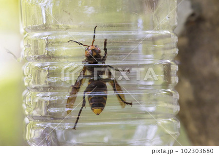 ペットボトルの捕獲器に入ったオオスズメバチ