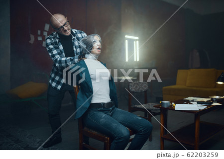 Crime. Two beautiful girls in the Business clothing kidnapped by criminals. Terrorist is threatening