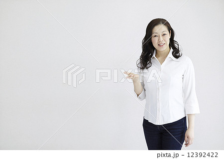 40代女性爽やご案内ポーズ自然光ポートレイト