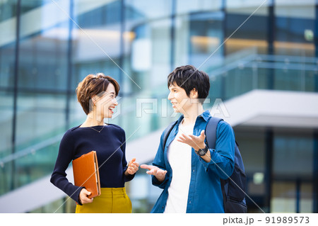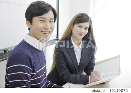 英会話教室の眼鏡をかけた西洋人の先生と若い女性 撮影協力:中央工学校付属日本語学校