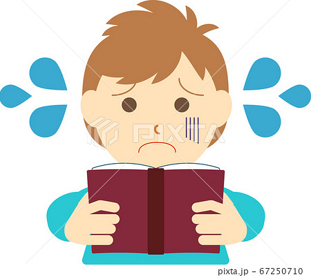 困った表情で本を読んでいる男の子-水彩