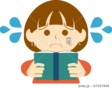 困った表情で本を読んでいる女の子-4色
