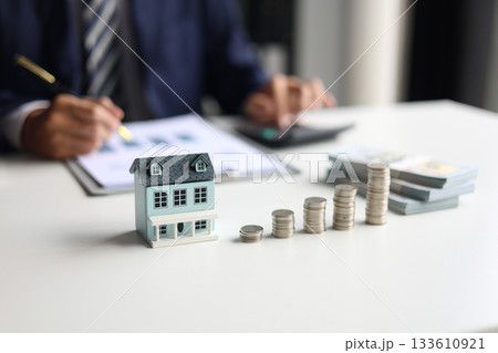 Model house, stacks of coins, calculator, financial documents on a wooden desk represent real estate investment and mortgage planning, highlighting financial growth and strategic planning strategies.