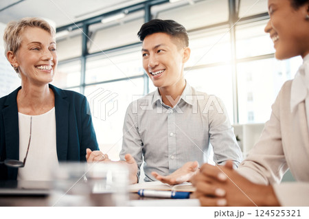 Business people, smile and collaboration for meeting, teamwork or corporate strategy at the office. Group of creative employee workers in team discussion, conversation or workshop for project plan
