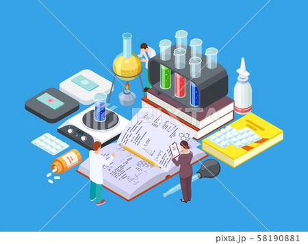 Scientific research laboratory. Isometric chemistry equpment and sciensists, pharmaceutical lab