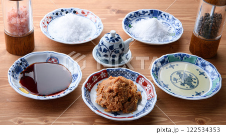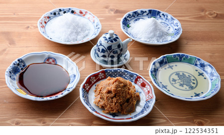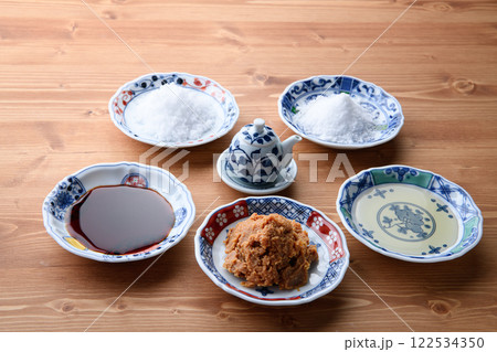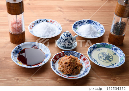 色々な調味料 ( 砂糖 塩 お酢 お味噌 お醤油 )調味料の「さしすせそ」
