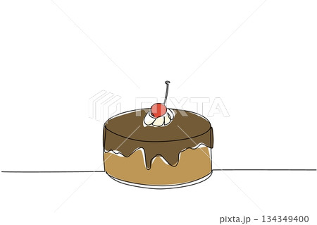 Single one line drawing round cake covered in chocolate with cherry topping. Simple topping but extraordinary taste. Tasty. National Cherry Dessert Day. Continuous line design graphic illustration