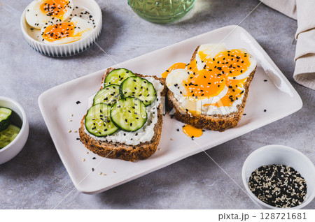 Cereal bread with cottage cheese, boiled egg and cucumber on a plate on the table