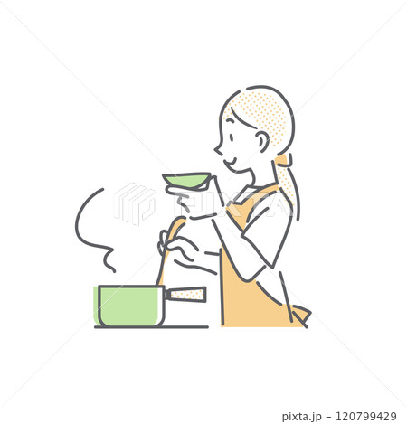 料理中に味見をする女性 シンプルでお洒落な線画イラスト
