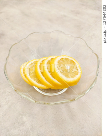 Lemon slices resting in glass bowl on marble countertop