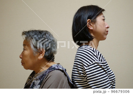 背中合わせの高齢女性と中年女性 喧嘩・いがみ合いのイメージ