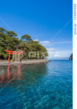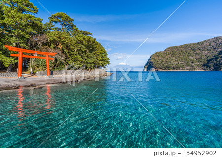鳥居と駿河湾と富士山 「沼津市戸田 御浜」